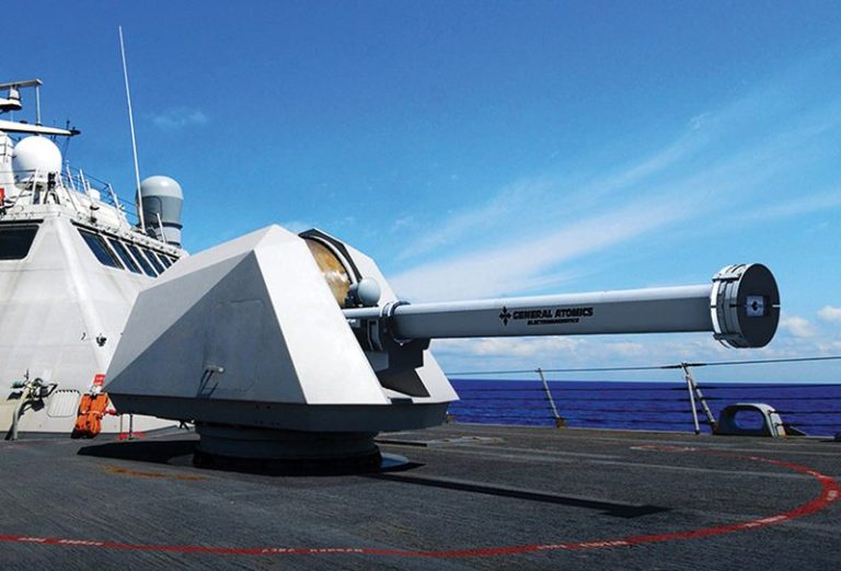 Right: A shipboard rail gun. A high velocity kinetic weapon originally proposed for the S.D.I.